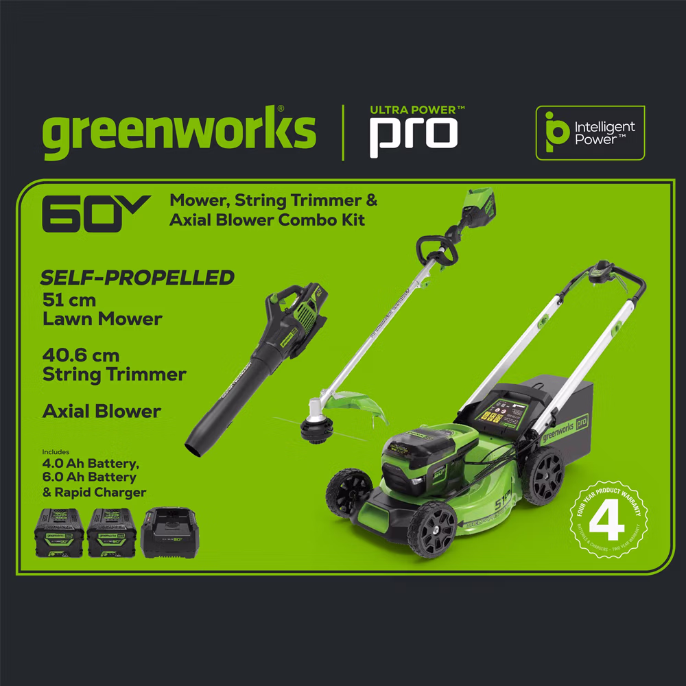 | Kit Includes | 1 x GREENWORKS 60V 51cm Self-Propelled Lawnmower Skin #2515207AU 1 x GREENWORKS 60V Brushless Axial Blower Skin #2405907AUVT 1 x GREENWORKS 60V String Trimmer Multi Tool Skin #2109007AU 1 x GREENWORKS 60V 6.0Ah Li-Ion Battery #2935907AU 1 x GREENWORKS 60V 4.0Ah Li-Ion Battery #2935807AU 1 x GREENWORKS 60V 6A Fast Charger #2936107AU |